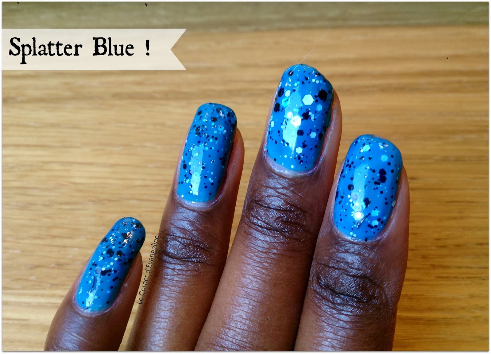 - « Splatter Blue« , trouvé chez Claire’s lors d’une escapade pour des élastiques à cheveux. C’est un vernis avec des paillettes blanches et noires de plusieurs tailles avec une base bleue foncée. Une fois posé sur les ongles, il est censé faire penser à des tâches de peinture.